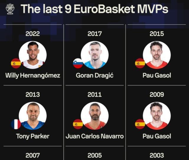可以看到,只有加索尔曾两次赢得MVP,作为这届赛事的三位超级明星,约基奇、东契奇和阿德托昆博均不曾赢得这个奖项,东契奇尽管曾赢得欧锦赛冠军,但2017年他还是德拉季奇身边的副手。约基奇、字母哥上届欧锦赛个人发挥出色,但无奈他们所在的球队都早早出局。